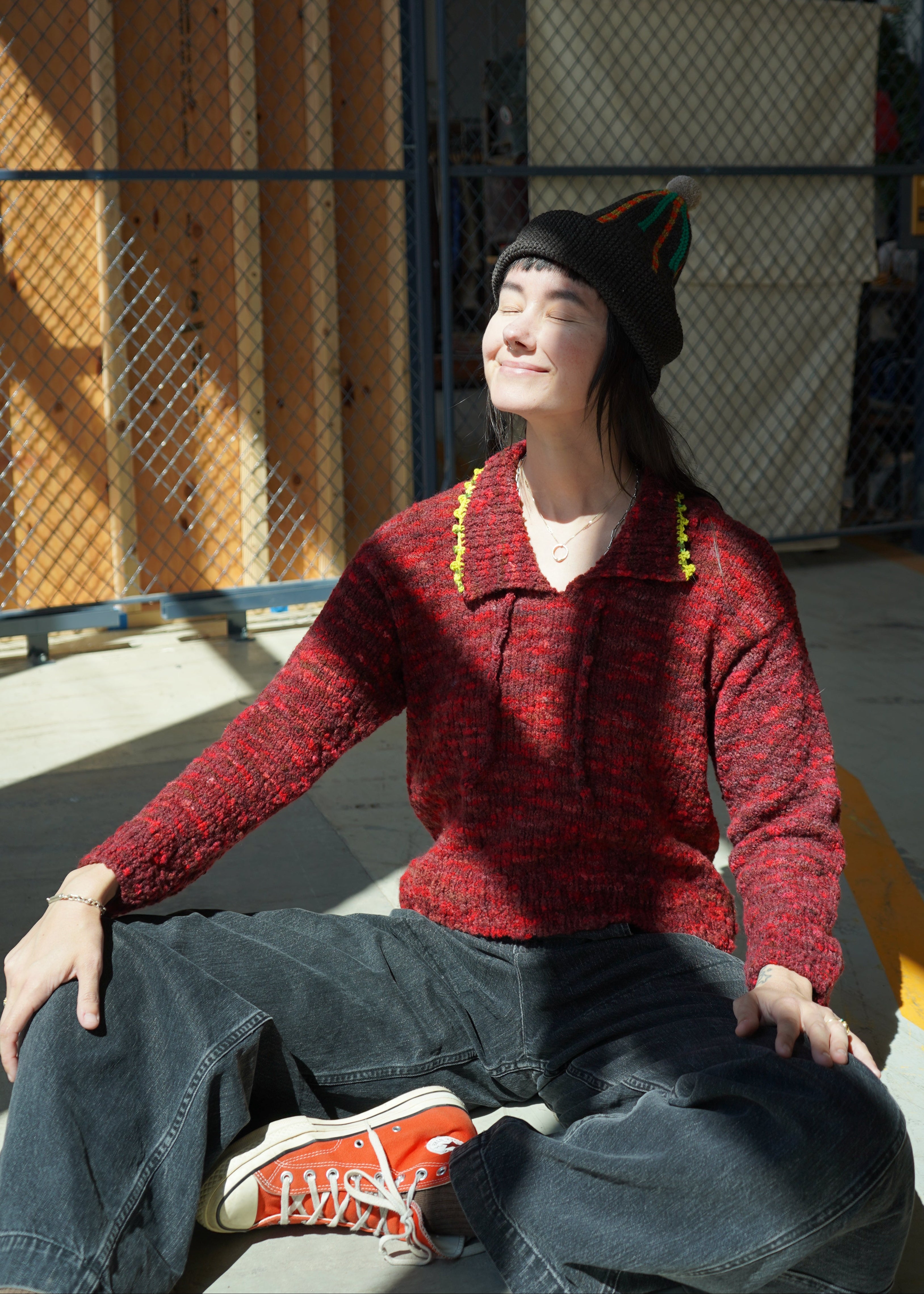 They’re designed as companions because you can make both with just two skeins of our DEGEN DK yarn. For the samples, we used Ferrari (a fiery red) and Linen (a soft neutral) and topped the hat with one of our signature smiley pom poms.