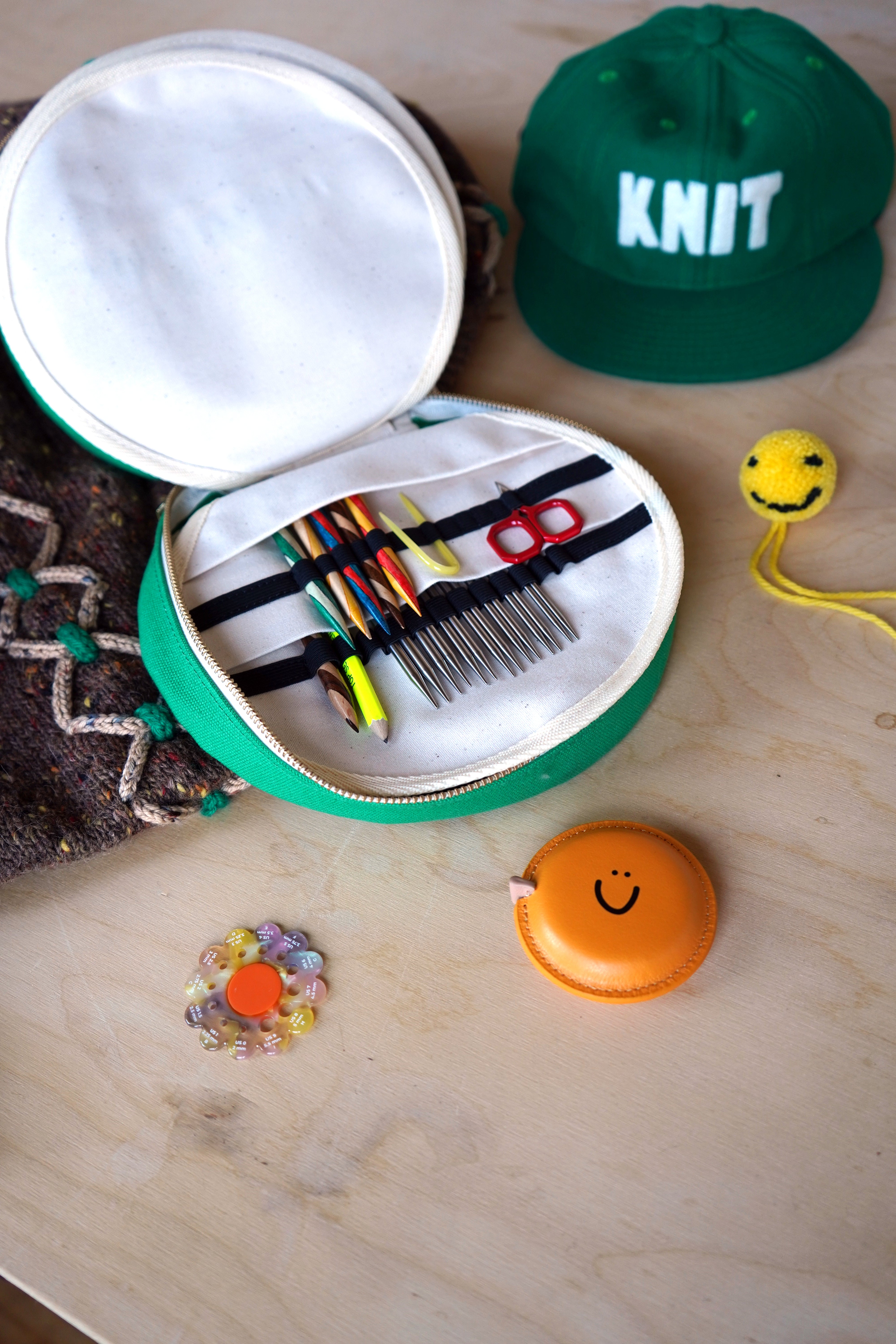 The sweetest hand crafted tins hold barber cord and stitch markers and fit perfectly in the elasticated back pocket of the Needle Case