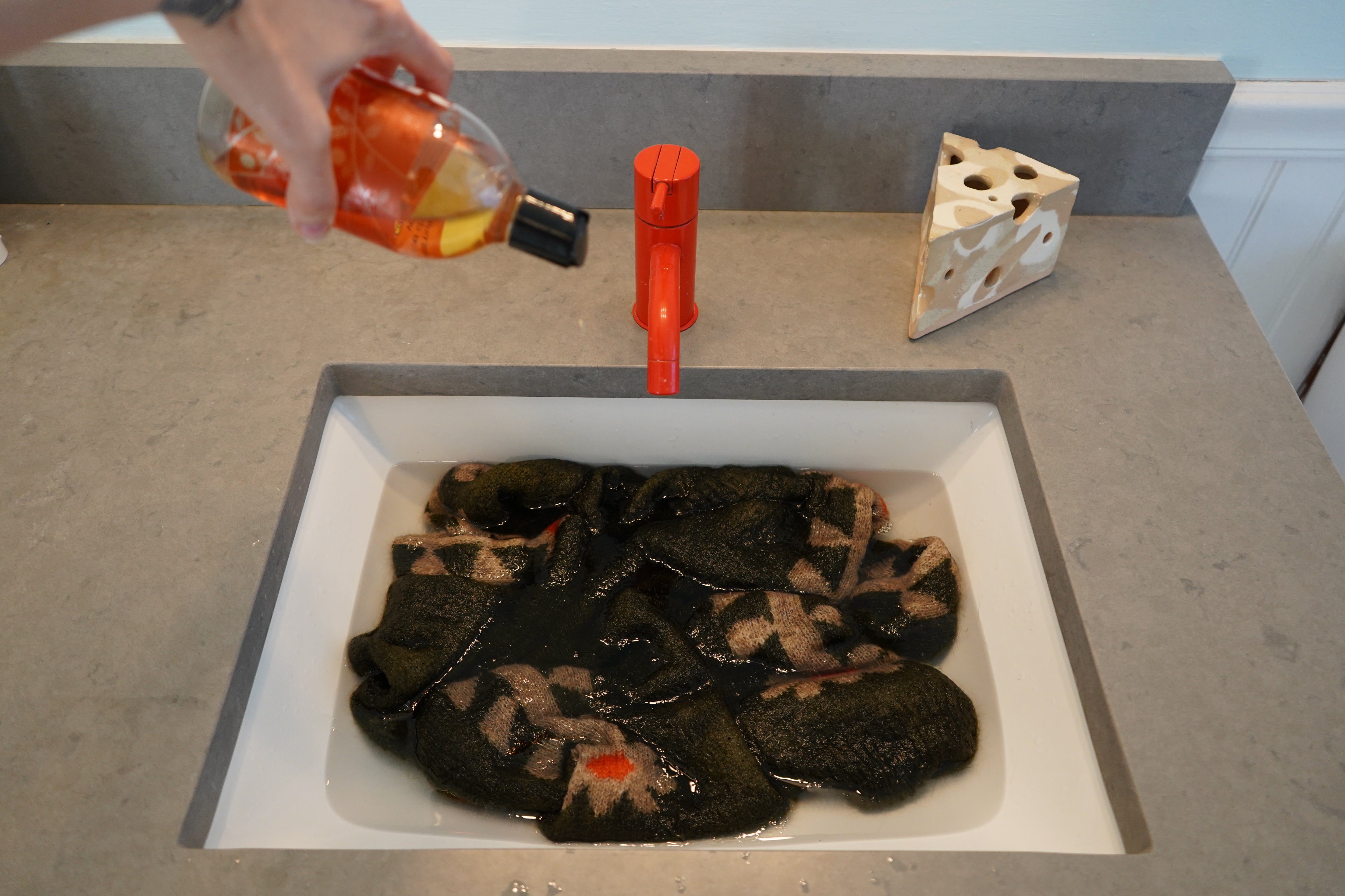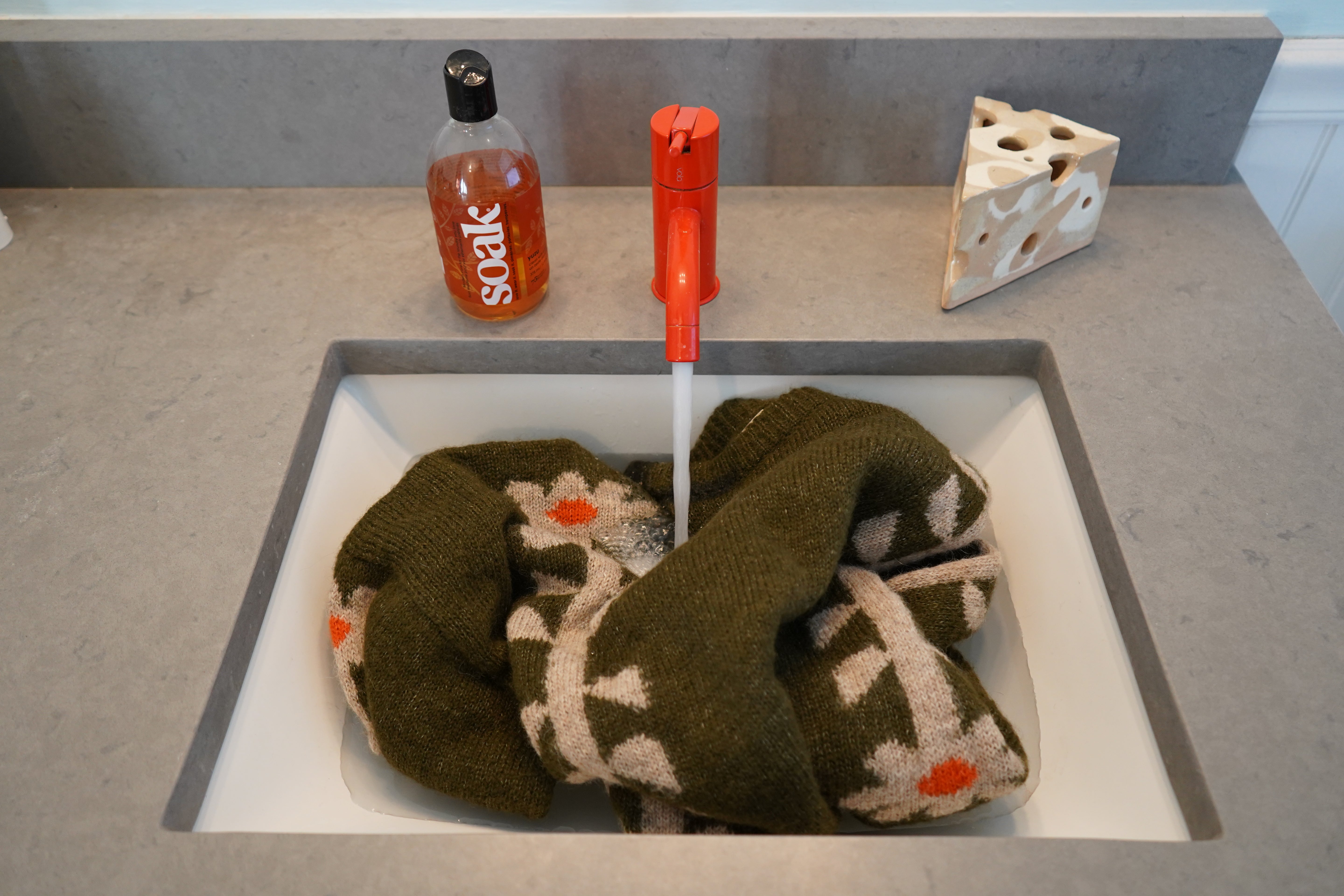 Submerge your knits in cool water with a wool detergent. We recommend Soak. With Soak, your knit just needs to sit in the cool water for 15 minutes. No rinsing required.