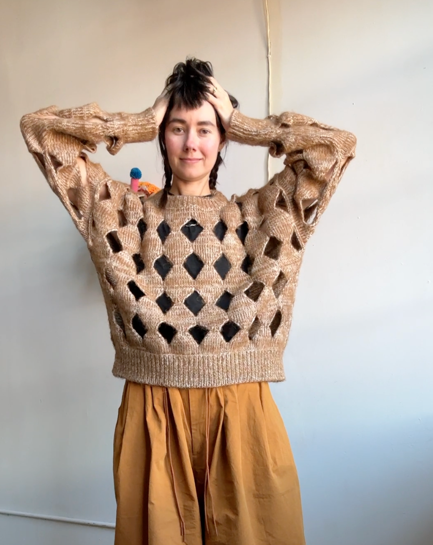 Harlequin diamonds reveal what you are wearing underneath to create a depth to the visual.  Each diamond is shaped by increasing a decreasing the number of stitches by hand in individual groupings and is created with the profound beauty of high craft. The sweater base is 100% Andean Highland Wool knit with a thin fuzzy alpaca yarn that gives the color depth and dimension.