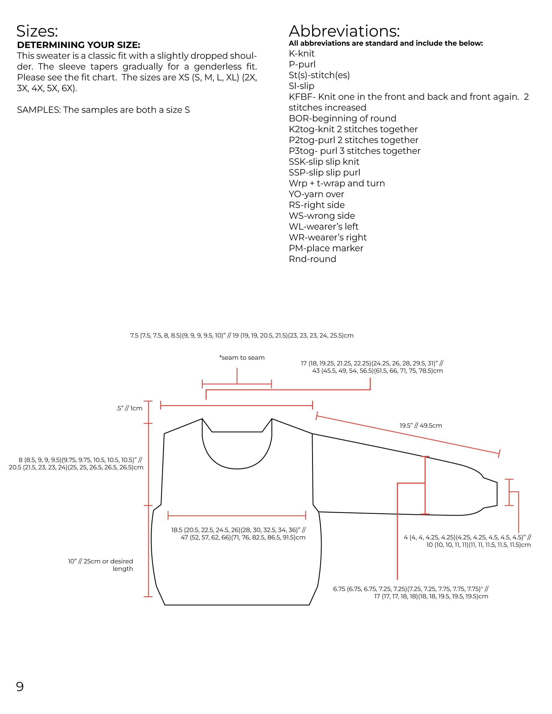 This sweater is a classic fit with a slightly dropped shoulder. The sleeve tapers gradually for a genderless fit. Please see the fit chart. The sizes are XS (S, M, L, XL) (2X, 3X, 4X, 5X, 6X). See the final page of the pattern for more detailed information and the spec chart. This sweater is intended to have 5-7” positive ease.