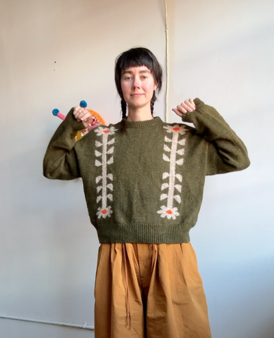 A seriously warm but very light pullover featuring flowers inspired by traditional Americana quilt motifs. This is a ready to wear take on our most popular hand knitting pattern. Moss is a very slightly olivey brown color.
